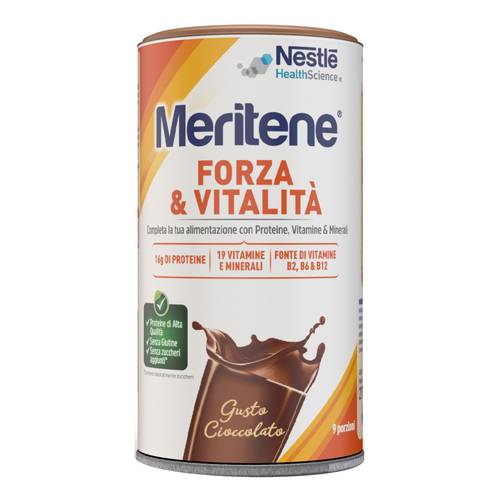 MeriteneGusto Cioccolato Descrizione Preparato solubile per bevanda, ad alto contenuto di proteine, addizionato con vitamine e minerali. Le proteine, di alta qualità, contribuiscono al mantenimento della massa muscolare. Calcio e vitamina D contribuiscono al mantenimento di ossa normali e della normale funzione muscolare. Le vitamine B2, B6 e B12 contribuiscono a ridurre la stanchezza e l’affaticamento. Il magnesio contribuisce al normale metabolismo energetico. Vitamina C, zinco e selenio che contribuiscono alla normale funzione del sistema immunitario. Senza coloranti e zuccheri aggiunti (contiene naturalmente zuccheri...